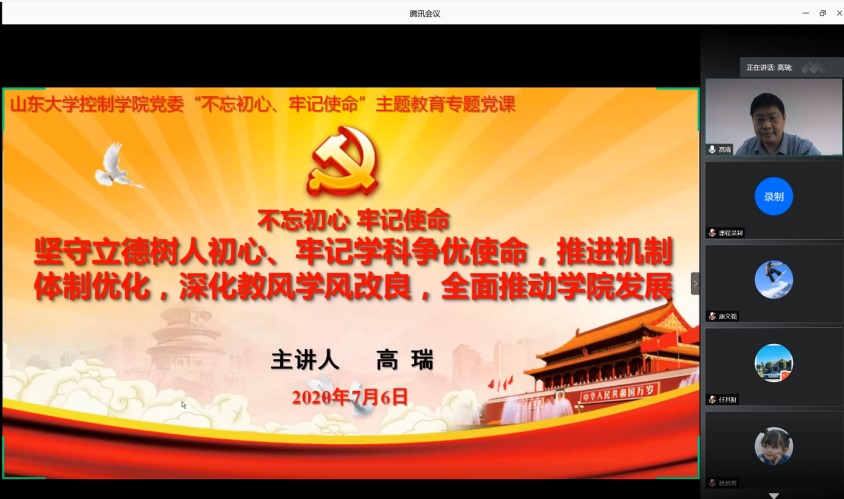 为庆祝中国共产党成立99周年,贯彻落实教育部党组《关于在教育部直属高校和部省合建高校各级党组织开展“四个一”行动方案》和山东省委教育工委《关于开展“我来讲党课”活动的通知》精神,近日,十大买球的正规网站党委书记高瑞给学院全体研究生党员讲授了“不忘初心、牢记使命”主题教育专题党课,授课以线上线下结合的方式进行。
