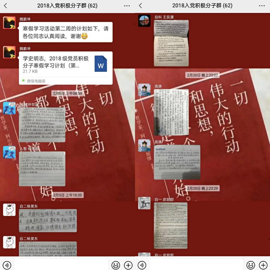 在针对2018级党员、入党积极分子开展的“学史明志”理论学习活动中,共分为四个学习小组,进行为期一月的“听说读写练”系列主题教育活动,每日利用30-60分钟进行相关学习。本次学习活动“以老带新”,充分发挥朋辈帮扶作用,党员、预备党员对入党积极分子进行对接指导,借助学习强国平台进行纪念馆里的党史、党史故事100讲、中国制度面对面与时政新闻等内容学习,同时组织入党积极分子抄写党章并进行每日打卡。活动结束后,各组成员将撰写学习情况总结及感悟,以落实学习成果,引导同志们以史为鉴、以史为师,从而数往知来、行稳致远。参加本次“学史明志”理论学习活动的59名同志坚持连续学习四周,完成视频学习54期,时政新闻学习、党章抄写打卡28天。在此过程中,同志们认真领悟共产党员“我将无我,不负人民”的初心,增强“踏石有印,抓铁留痕”的决心,树立“不念过往,不畏将来”的信心,以历史结合现实学、理论联系实际学,适应新时代新要求,在思想、政治、行动上同党保持高度一致。
