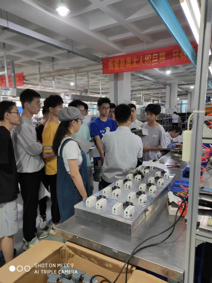 7月3日,李现明教授带领同学们深入奥太公司各部门工作一线进行实践活动,重走奥太焊机研发、设计、生产“长征路”,感悟产品研发、生产设计和产业化历程。在奥太公司总部研发部,同学们现场考察研发工程师的日常工作状态与感受真实的研发现场,近距离观摩奥太公司正在进行的研发项目。随后,同学们分组分项目对逆变焊机的完整生产线,包括逆变焊机的技术细节进行深入学习、实践。通过在生产计划与调度工程师、生产技术工程师、质量管理工程师岗位上的实践活动,使同学们深刻理解了自动化专业强电与弱电相结合、软件与硬件相结合、元部件与系统集成相结合的独有特色和跨学科、跨行业的本质特征。