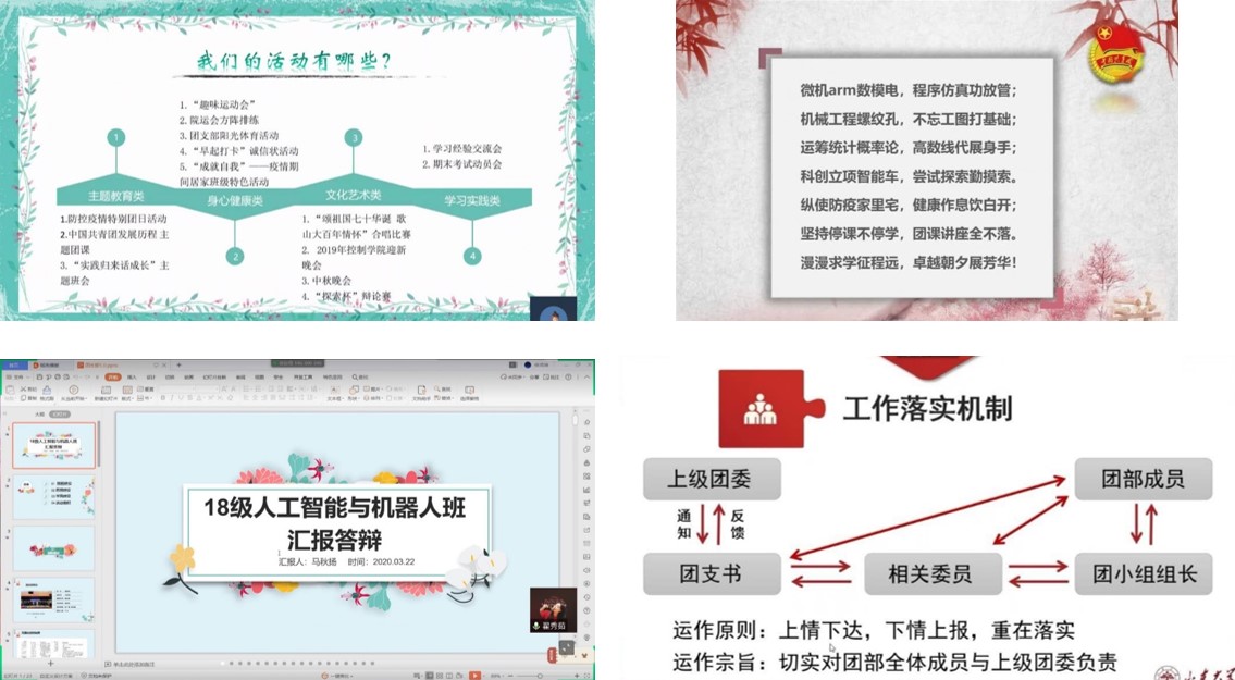本次线上答辩采用语音和PPT相结合的方式,各团支部需要在限定的三分钟之内完成答辩,评委们会在各团支书答辩结束后提出问题,根据答辩情况公正给出评分。各团支部书记在答辩中对本支部在2019年度的制度建设、思想引领、拓展培养计划开展情况、支部特色以及疫情期间支部工作开展情况和下一步工作安排进行了汇报,各位评委老师也分别针对各支部的汇报内容进行了点评,肯定了各团支部开展的各项工作和特色经验,并对今后的团支部建设提出了指导意见。答辩会末,刘慧慧老师针对今后团支部的建设工作提出了建议。她提到,各支部负责人应不断加强团的基层组织建设和基层工作,将支部制度做实做细;应以服务学生成才成长为中心,加强同学思想引领,积极建设优良学风,以提高团员青年综合素质为主要目标积极鼓励学生开展拓展培养活动,同时做好困难学生的关怀和帮扶工作,使团支部真正成为团员之家、学生之家。刘老师还强调,团支部负责人需要切实做到上情下达、下情上传,不断提升团支部工作水平。