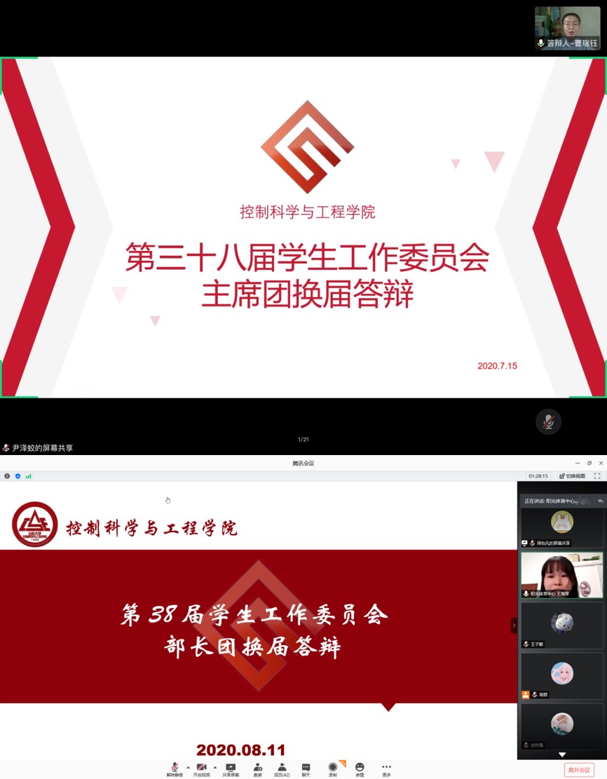 换届工作第三阶段,竞职答辩借助腾讯会议分别于7月中旬和8月中旬线上顺利完成。竞职答辩主要分为4分钟竞职演讲、1分钟现场抽题作答和评委提问三个环节。答辩过程中,竞职候选人表达了自己对竞职岗位的深刻理解,并对评委提出的“学生工作改革与创新点、对所竞聘职位的认识、未来工作设想”等问题展示了自己的独特见解,条理清晰,准备充实,均表示自己有决心、有信心将本职工作做好,为学院学生工作献言献策,锐意进取,为同学服务贡献自己的力量。