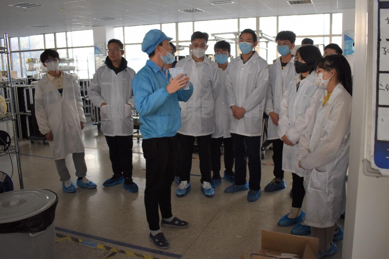 活动伊始,在人力资源部副经理彭洋的带领下,全体成员在一楼展厅参观神思公司的主要产品,了解公司的发展历程和主要研发方向。随后参观成员分为两组,身着工作服进入表面组装技术(SMT)生产车间参观学习。车间人员为同学细心讲解印刷、贴片、焊接、检测的整套板卡焊接流程,实操展示了神思多功能身份认证产品的使用过程和讲解认证机的识别原理。
