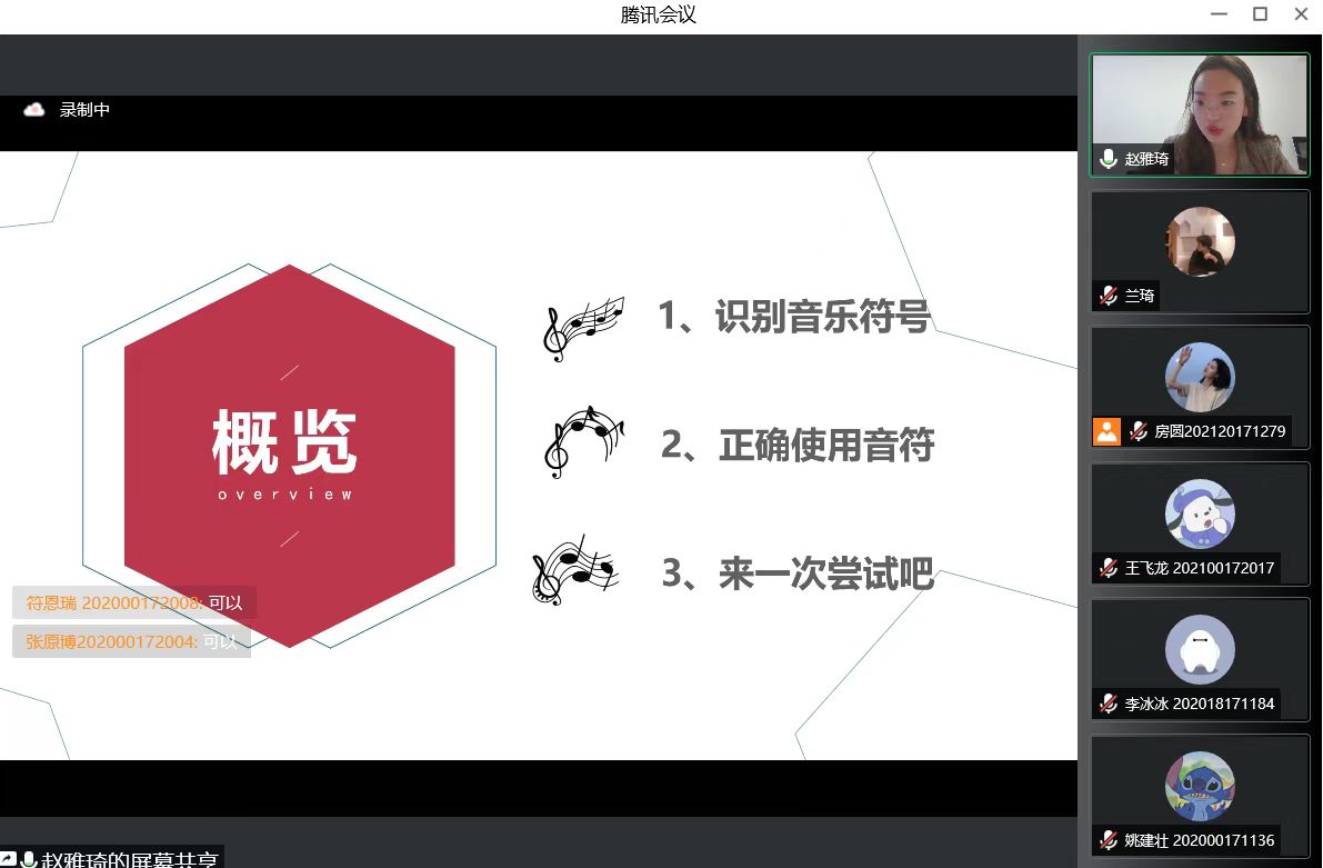 赵雅琦向大家讲授了五线谱的基本要素以及五线谱与简谱的区别与联系,并在此基础上引入节奏型,在类比中向大家讲授了有关简谱与五线谱节奏型的相关知识,讲解清晰,生动有趣。赵雅琦带领同学们用所学的节奏型知识尝试打出几段乐谱的节拍,学以致用,在实践中巩固同学们学到的知识。通过与同学们的互动,调动大家的积极性,共同感受音乐的魅力。