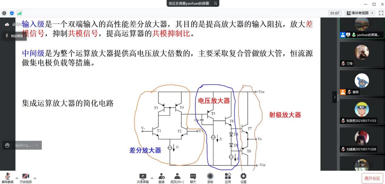 本次活动旨在帮助同学们了解学习数模电知识,快速入门电子设计科创制作,拓宽专业视野,提升知识储备,鼓励广大学子积极参与科创比赛,学以致用、以赛促学。姚福安以运算放大器的基本原理及应用为主题,从放大器的基本概念与集成放大器简介及等效模型两个方面展开详细的讲解。讲座介绍了四种放大器的基本模型及其基本特点,借助电路图具体分析,详细讲解了放大器的七种主要性能指标,带领同学们初步认识和了解了放大器。随后,姚福安带领同学们走进目前应用最广泛的电压型集成运算放大器,了解其基本结构和特点,熟悉运算放大器的模型和传输特性,介绍了差模信号与共模信号。姚福安将讲解的内容与实际应用相结合,节奏适中,进度贴合同学们的理解程度与目前的知识储备,更好地帮助同学们学习应用数模电知识,为日后的实战练习做好充分的准备。