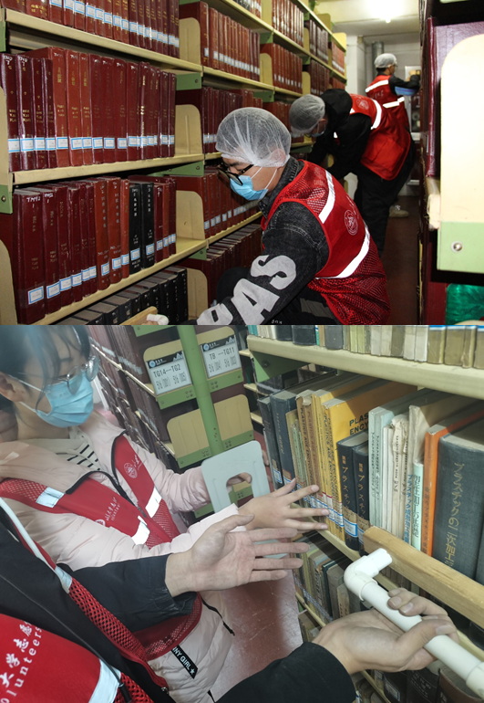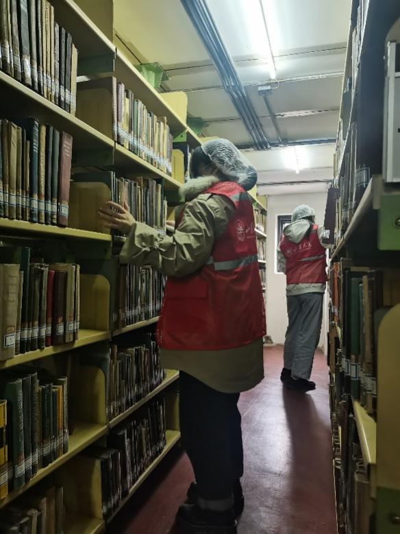 本次服务的主要内容是整理外文书库。在图书馆老师的指引下,头戴防尘帽的队员分成两个小分队,以书库入门为扩散点,分两个方向,使用专门的排架工具对书架上的书籍进行整理与排版,在排好书籍的同时,检查书籍是否倒立放置,同时避免对书架造成损坏。