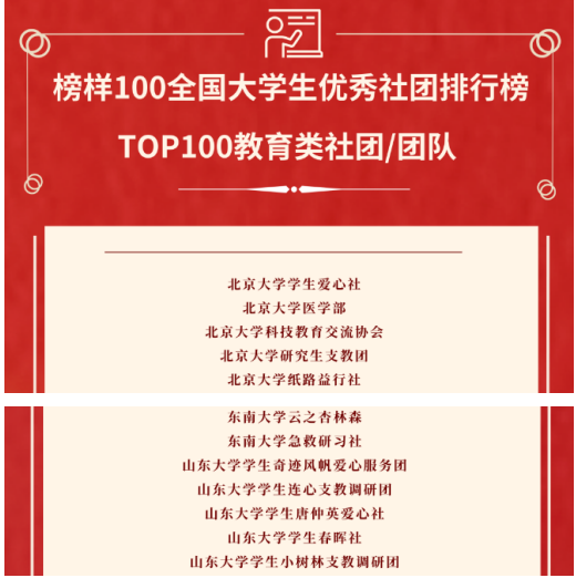 “榜样100”全国优秀大学生社团榜单由中国大学生社会实践知行促进计划(简称“知行计划”)、青年影响力创新中心联合发布,旨在鼓励和表彰始终活跃在乡村振兴、助学支教、环境保护、专业赛事、创新创业等各式青年行动一线的高校大学生社团、团队。本届榜样100开放四大赛道,表彰在环境类、教育类、学术类及文体类表现突出的社团团队。