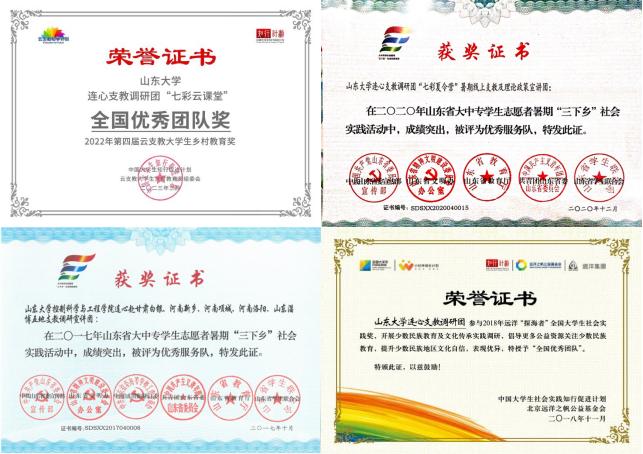 十大买球的正规网站学生连心支教调研团连续多年被评为十大买球的正规网站优秀社会实践团队、山东省优秀社会实践团队,获评2019年“榜样100”全国最佳大学生社团,曾获2022年第四届大学生云支教乡村教育奖、阿克苏诺贝尔全国大学生社会公益奖、全国远洋之帆大学生社会实践奖等。