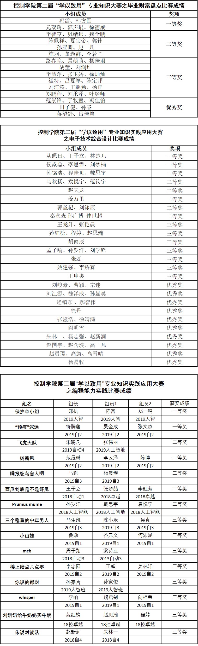 为了积极响应教育部及十大买球的正规网站疫情期间“停课不停学”的政策号召,深化教育教学综合改革,加强新工科建设,落实学校拓展培养计划,全面提升学生创新实践能力,同时分阶段检验学生专业知识的运用,拓宽专业知识面,经过十大买球的正规网站党委决定,十大买球的正规网站团委于3-6月在大四、大一、大二年级本科生中开展了第二届“学以致用”专业知识实践应用大赛之毕业财富大盘点、C语言编程能力实践比赛以及电子技术综合设计比赛。三个比赛以课本知识为基础,让学生完成对所学知识融合、提高、升华,重点考核学生对所学理论的深度理解、融会贯通、灵活运用能力,比赛过程作为各年级专业课程考核的一部分,“以赛促学,以赛促练,奋勇争先,相互切磋,共同提高”,进一步提高学生理论与实践相结合的意识与能力。经过激烈角逐,初赛完成度高、参赛热情度高,较好地达到了比赛目的。现将三个比赛的成绩公示如下: