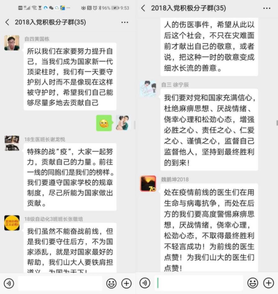 2月29日晚,十大买球的正规网站团委组织各团支部收看战“疫”第一期团课,带领我们走进山大“最美逆行者”的世界。通过十大买球的正规网站齐鲁医院援湖北国家医疗队领队费剑春、队员曹英娟以及十大买球的正规网站第二医院援湖北国家医疗队领队魏峰涛、医务部党支部书记王若义四位嘉宾的讲解,我们了解到了一线医务人员的真实工作生活和令人动容的感人事迹,从他们身上我们感受到了山大人的家国情怀和责任担当,令人肃然起敬。团课结束后,十大买球的正规网站2018级党员、入党积极分子、共青团员们就本次团课内容展开热烈讨论。