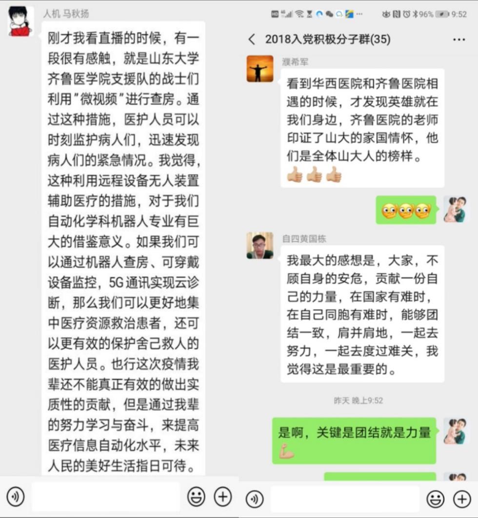 在讨论中,有同学表示,看到华安医院和齐鲁医院相遇时,发现英雄其实就在我们身边。在国家危难之时,我们团结一致,肩并肩地度过难关,证明了团结的力量和集体的优势,彰显出山大人的家国情怀。感动之余,同学们就身处后线的我们应该如何有所作为的问题做出思考和讨论。部分同学表示,我们要对党和国家充满信心,疫情期间提高警惕,杜绝侥幸心理。对现在的我们来说,守住后方,不为国家添乱,就是对国家最好的帮助。我们要努力提升自己,终有一天,我们会成为国家新一代的顶梁柱,此时,我们就要勇敢地去守护别人,尽量多地贡献自己。
