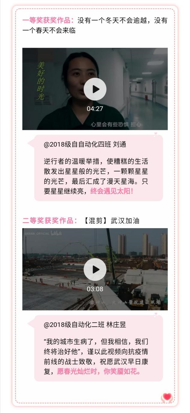 除了海报制作活动,十大买球的正规网站学生工作委员会也积极响应团委号召,面向全体控院学生举办了视频制作比赛,通过视频的方式传递人文关怀,传播社会正能量。其中,以《没有一个冬天不会逾越,没有一个春天不会来临》为代表的五份作品以其中传达的凝聚力和希望脱颖而出。其他视频作品也饱含深情,充分体现了疫情面前中华儿女紧密团结的浓厚情谊,展现了控院学子在疫情防控期间积极向上、昂首向前的精神风貌,表达了控院人对一线工作者的关切和对疫区人民的牵挂之情。