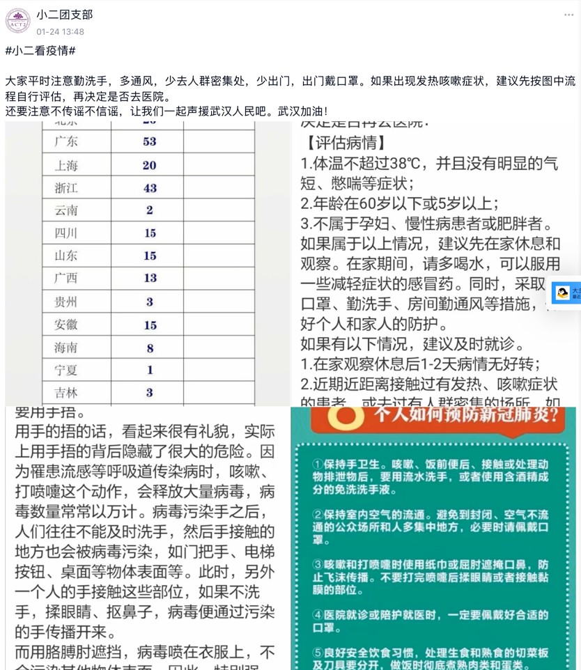 一方面,各基层团支部积极开展“防控疫情、从我做起”主题系列团日活动,组织同学进行线上防疫知识学习,并利用各团支部媒体平台等渠道广泛转发宣传相关知识,提升广大同学防疫知识储备,为个人防疫打下坚实基础。