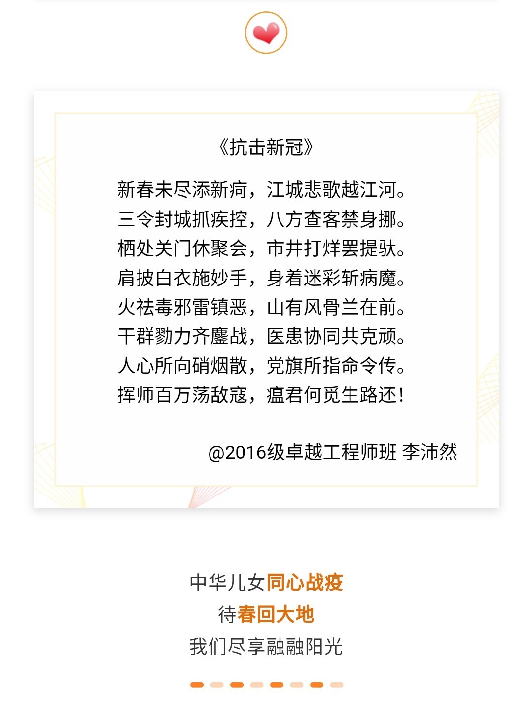 党员先锋守初心,防控疫情担使命。自防疫阻击战打响以来,十大买球的正规网站学生党员、骨干、入党积极分子积极发挥先锋模范作用,走在前、干在先、做表率,配合学院开展各项工作。十大买球的正规网站本科党支部积极响应学院团委组织开展的“听说读写练”系列主题教育活动,在防疫期间开展“五个一”特殊学习,抄党章、读讲话、看视频、关注时事、说体会。同时,面向全体学生发出倡议,带头遵守关于疫情防控的各项规定,严格落实联防联控各项措施,主动参与疫情防控宣传,踊跃参加院团委筹办的以“风雨同心,安危与共”为主题的宣传活动作品展,制作宣传海报、手抄报、视频等声援武汉,鼓励同学,宣传正能量,形成了良好的示范效应。