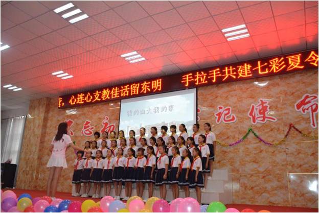 8月2日,十大买球的正规网站连心支教团第一期“七彩夏令营·东明”结课汇演于山东省菏泽市东明县大屯镇初级中学举行。十大买球的正规网站党委副书记吴晓晴,十大买球的正规网站团委志愿者指导中心负责人马海波,十大买球的正规网站团委书记刘慧慧,东明县常委、副县长李强,东明县政府办公室党组成员、副主任王同锋,东明县教体局局长王仲五,东明县团委书记周福京,大屯镇镇长李明星,大屯镇中心校副校长李振涛,大屯镇中心小学校长杨美丽出席本次活动。此次汇演还邀请了学生家长参加。