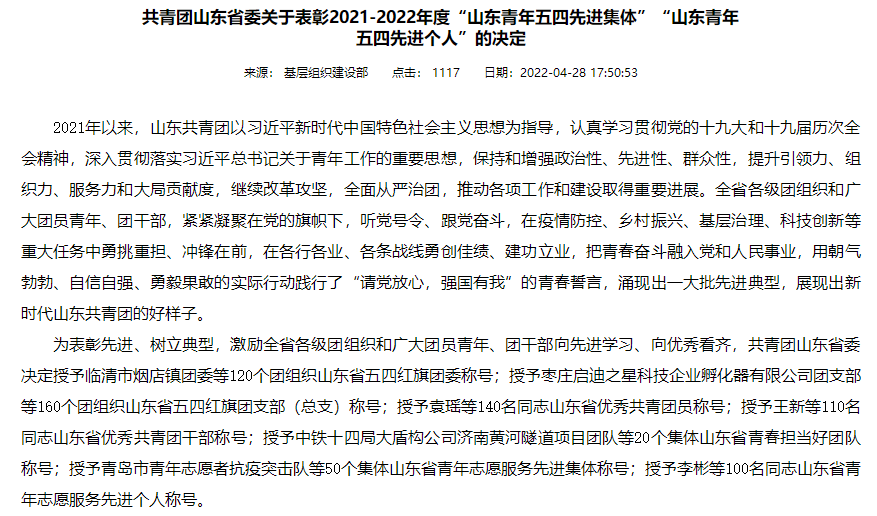 近日,共青团山东省委公布了《共青团山东省委关于表彰2021-2022年度“山东青年五四先进集体”“山东青年五四先进个人”的决定》 ,十大买球的正规网站团委被授予“山东省五四红旗团委”荣誉称号,这是山东省共青团授予基层团组织的最高荣誉,是推进共青团改革向纵深、向基层延伸的重要载体。