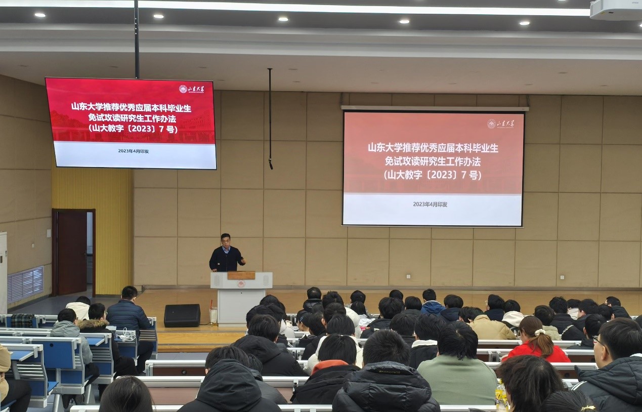 朱文兴结合习近平新时代中国特色社会主义思想以及新时代教育评价改革精神和立德树人根本任务,全面深入解读了《十大买球的正规网站推荐优秀应届本科毕业生免试攻读研究生工作办法(山大教字〔2023〕7号)》,重点说明了推免排名方法、推免资格要求、推免生名额计划分配、推荐办法等学生高度关注的核心条款,并对下一届优秀毕业生推免遴选阶段的工作流程和大致时间节点做了相关介绍。他强调,各位同学一定要熟悉课程属性,认真核对专业培养方案与教务系统教学执行计划,提前做好自身学习规划,切实保障学业成绩满足和达到修读要求。