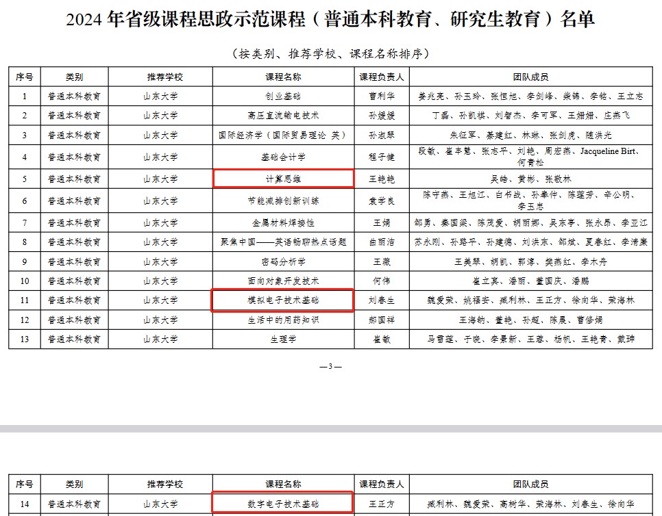 近日,山东省教育厅公布了2024年省级课程思政示范课程(普通本科教育、研究生教育)名单,十大买球的正规网站《计算思维》《模拟电子技术基础》《数字电子技术基础》获评山东省课程思政示范课程。目前,十大买球的正规网站共建设国家级课程思政示范课程1门、山东省课程思政示范课程7门、十大买球的正规网站课程思政示范课程14门。